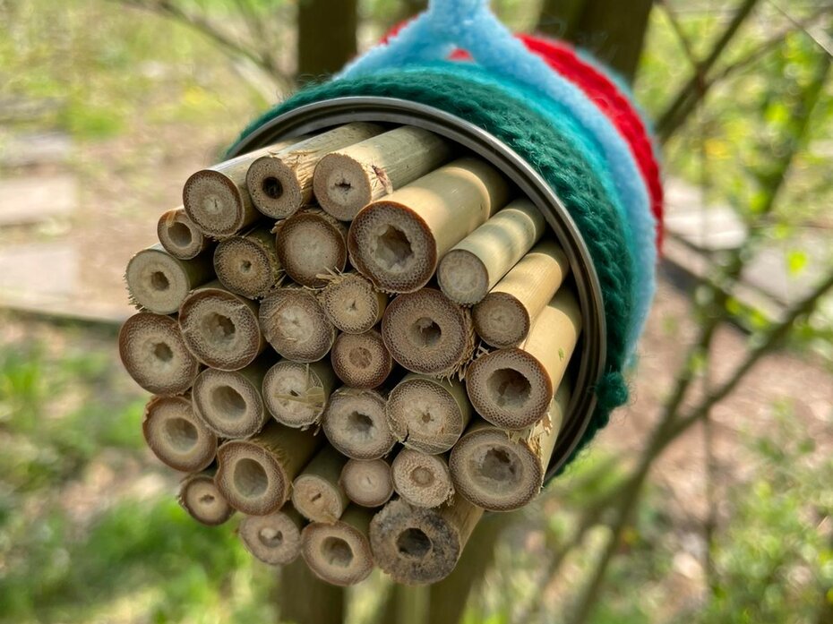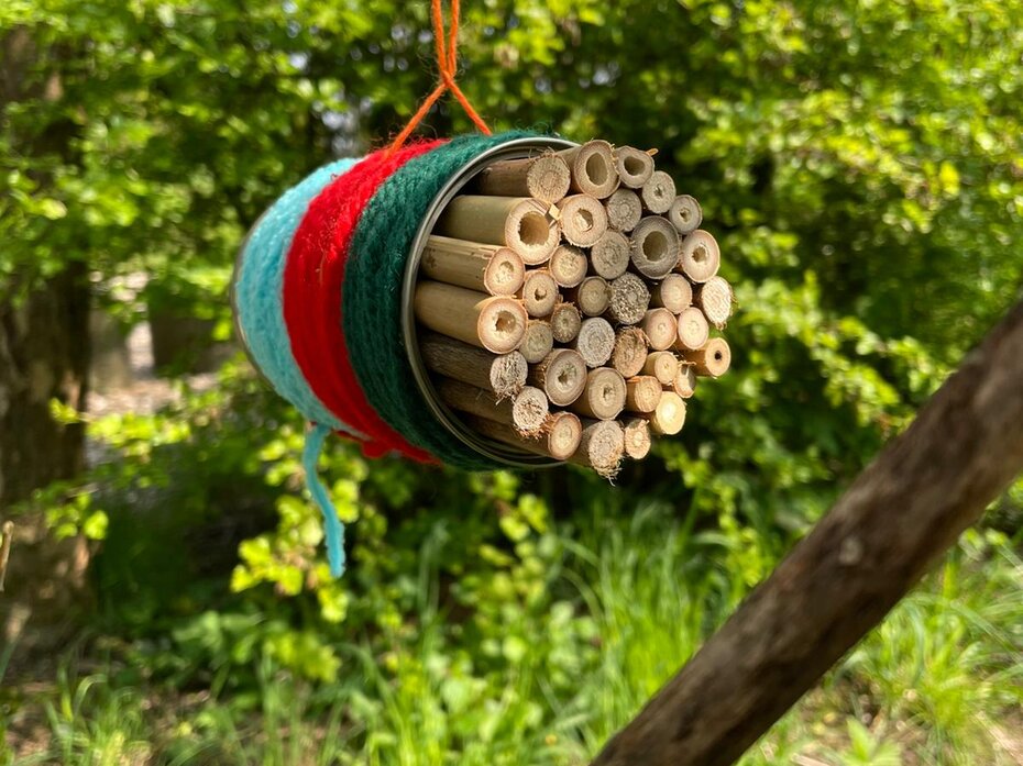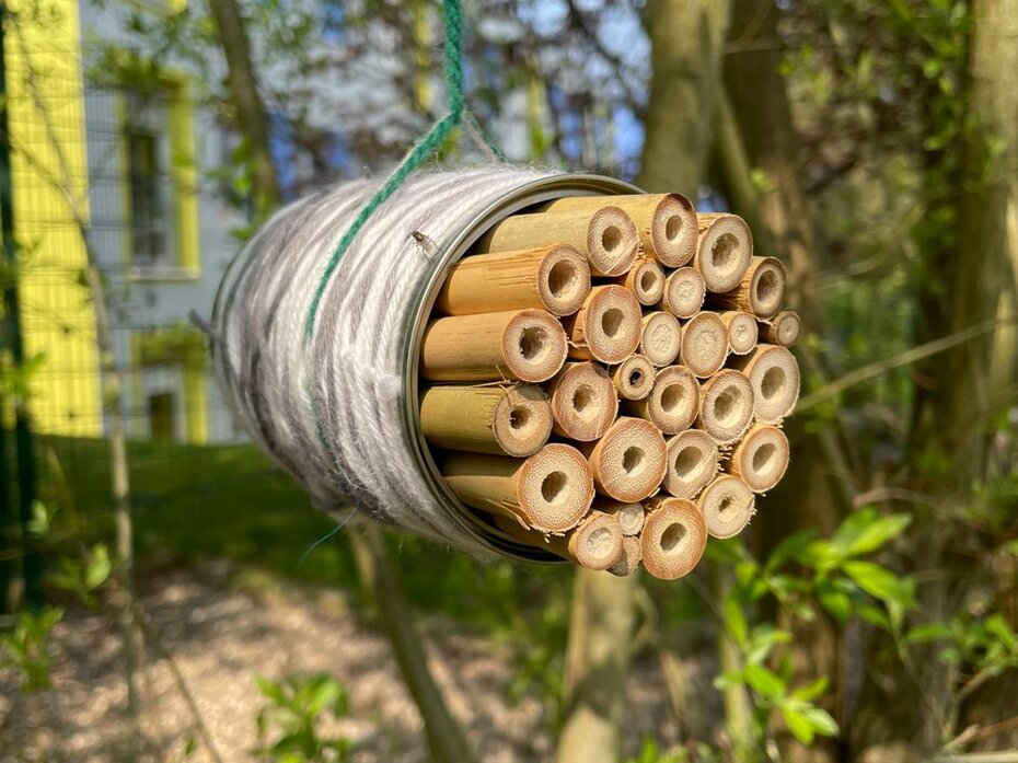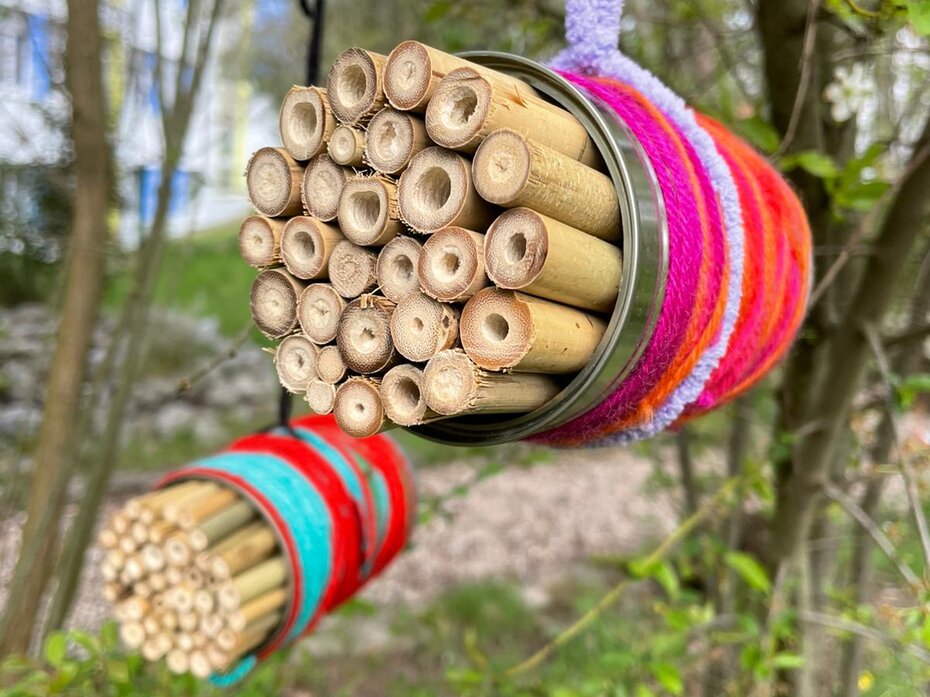 Um die Insekten bei ihrer Arbeit zu unterstützen, haben heute einige Kinder bunte Insektenhotels aus Konservendosen und Bambusstäben hergestellt. Unsere Insektenhotels dienen sowohl als Nisthilfe als auch als Unterschlupf zur Überwinterung. Durch die Nutzung von wiederverwendeten Konservendosen leisten wir zudem einen kleinen Beitrag zur Müllreduzierung. Vielleicht entdeckt ihr ja beim nächsten Besuch des Schulgartens unsere kleinen, bunten Insektenhotels.