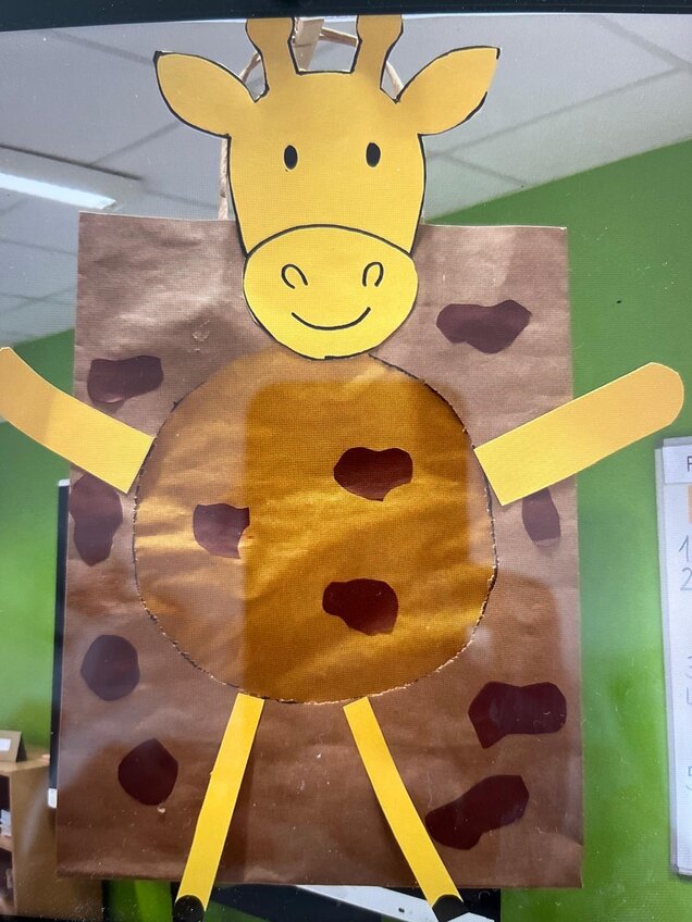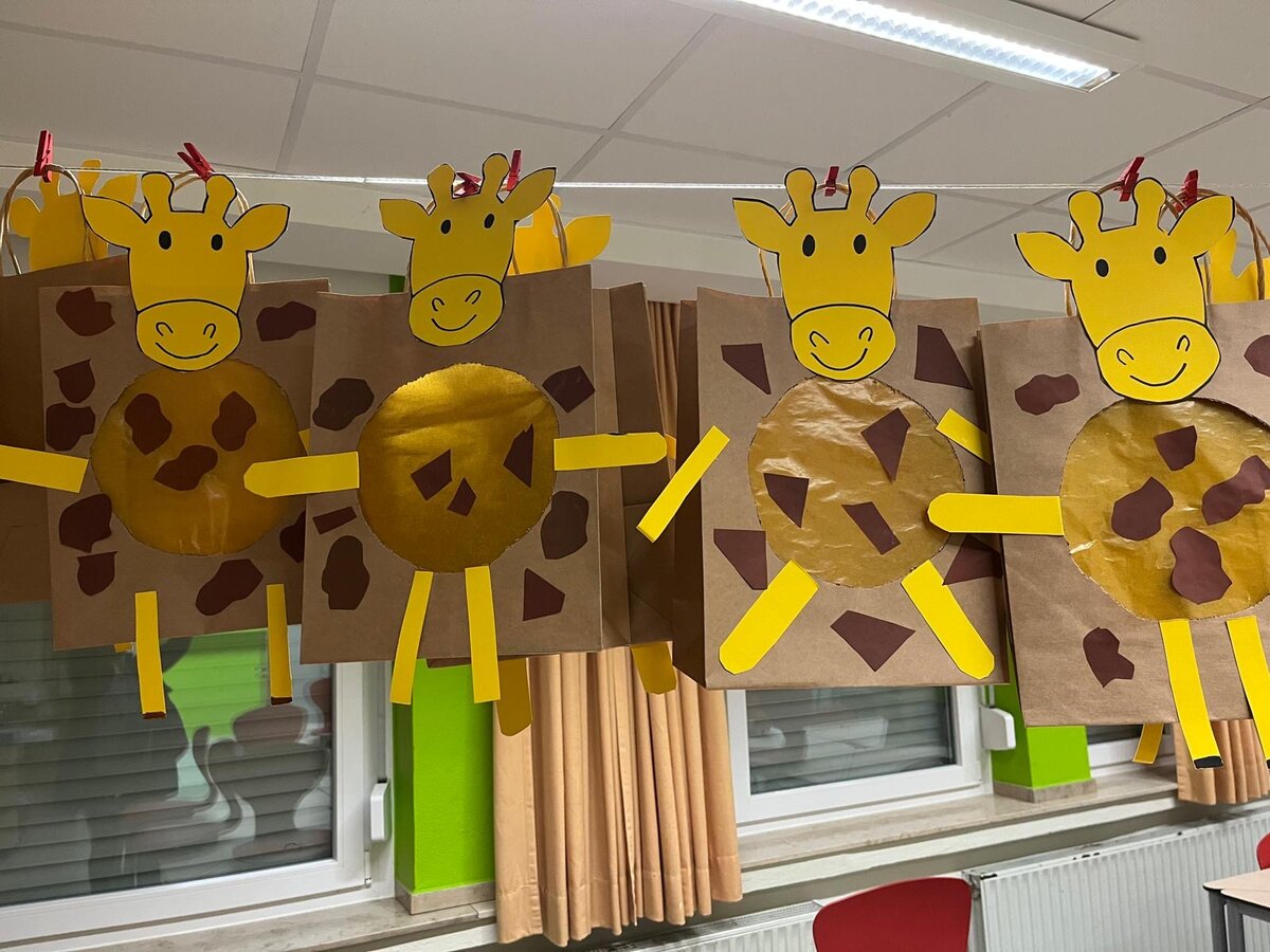 Wir haben mit Hilfe unserer Eltern eine wunderschöne umweltfreundliche Giraffenlaterne aus Papiertüten gestaltet. Zuerst haben wir mit Prickelnadeln den Körper von unserer Giraffenlaterne ausgeprickelt, um ihn dann mit orangefarbenen Transparentpapier zu bekleben. Anschließend haben wir mit helfenden Händen der Erwachsenen das Gesicht, die Arme und die Beine mit viel Kleber befestigt. Natürlich durften die Giraffenflecken auf der Laterne auch nicht fehlen.